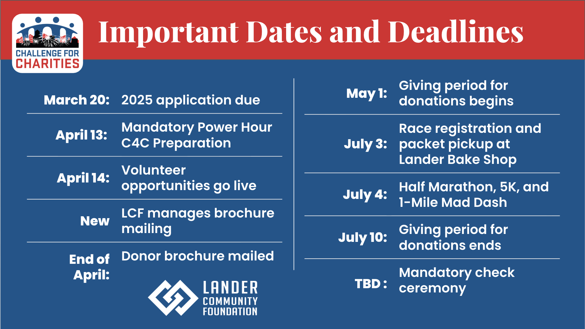 This information is for organizations interested in participating in the Challenge for Charities. The Lander Community Foundation is eager to support Lander’s nonprofit community and spotlight the tremendous work of our nonprofits.